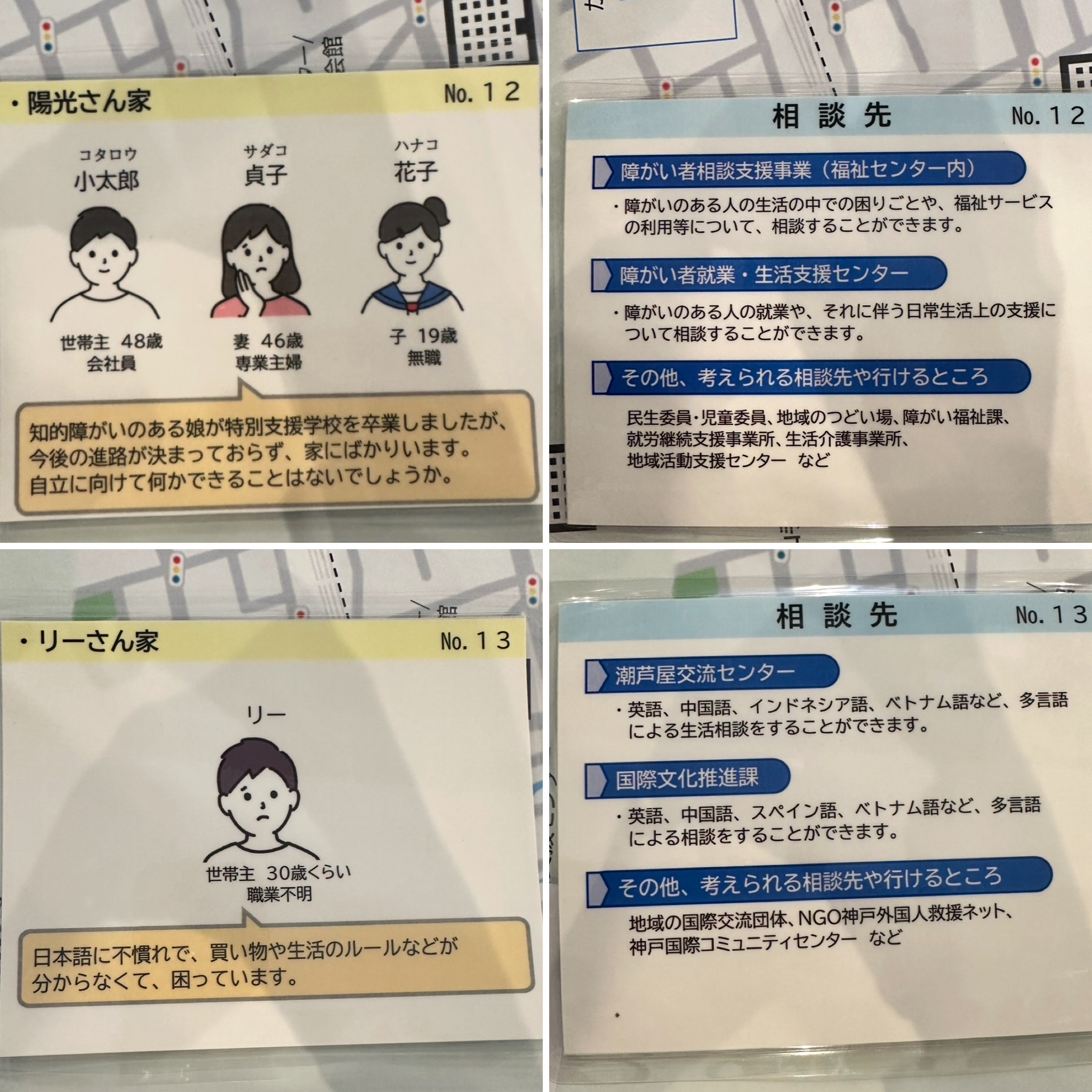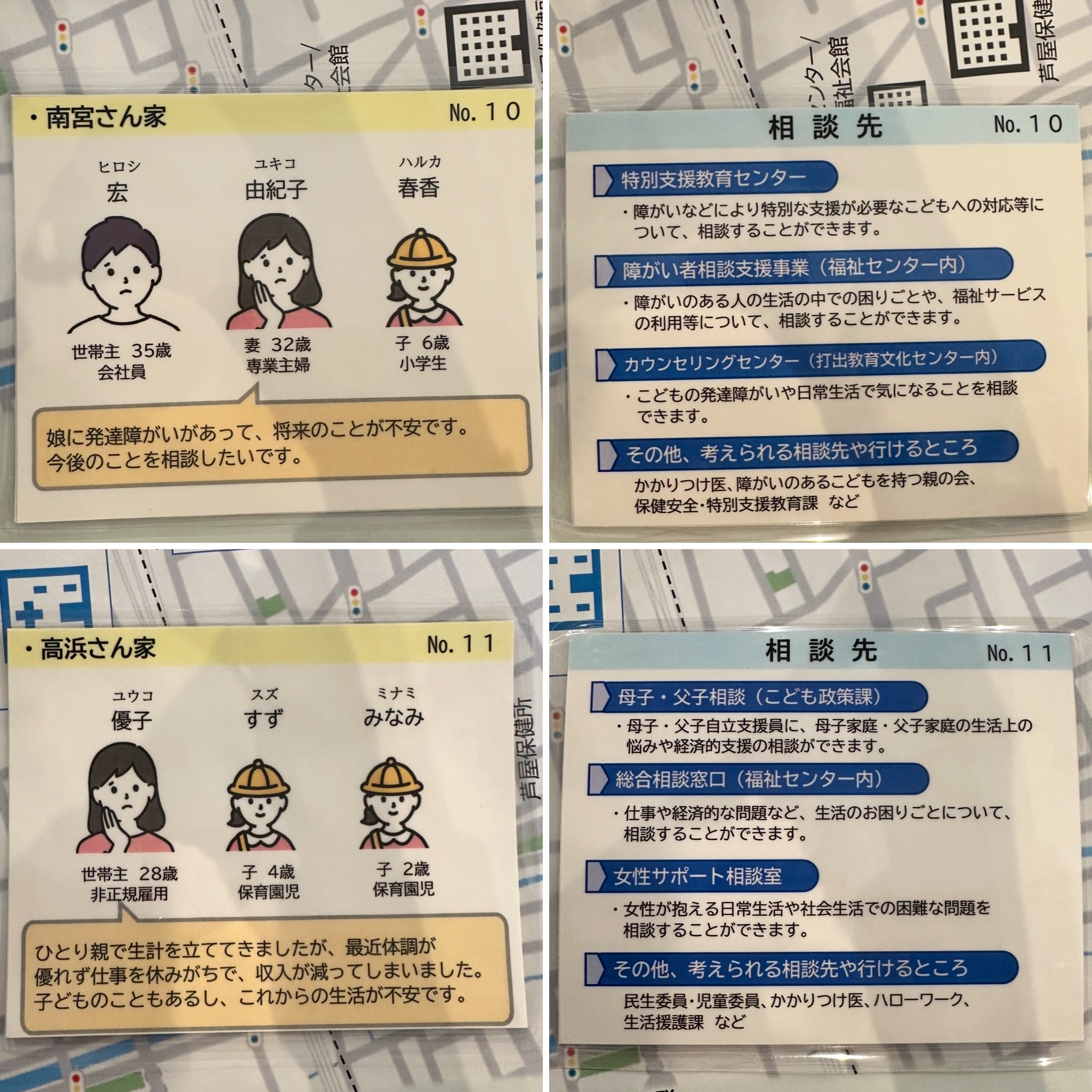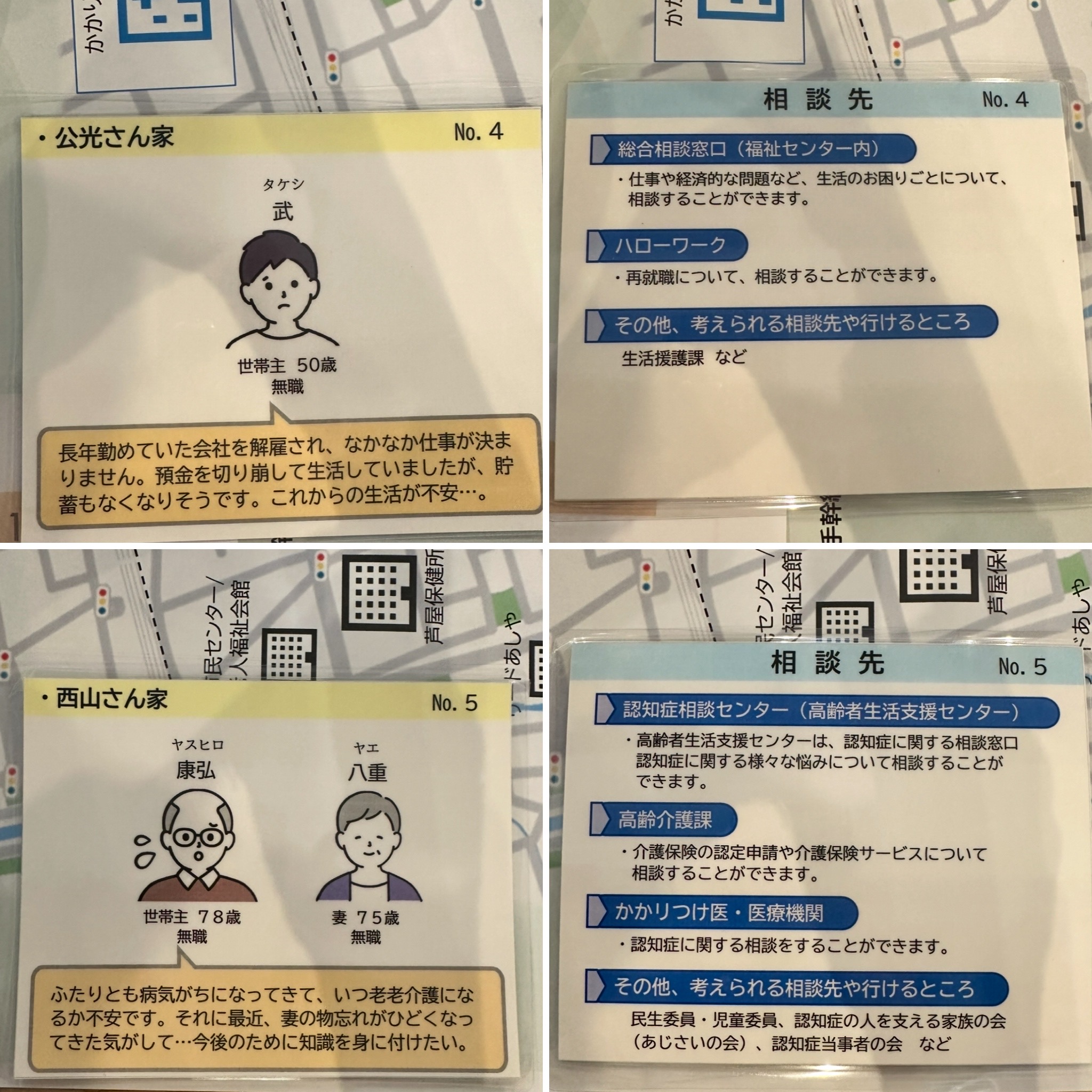 多くの人が最初に思い浮かべるのは「役所に相談する」という選択肢ですが、実際にはケースごとに、行政だけでなく、外郭団体や専門機関など、さまざまな支援先が用意されています。その導線がとてもよく考えられたカード構成になっており、「ありそう」「実際に起きそう」なパターンが丁寧に想定されている点が印象的でした。