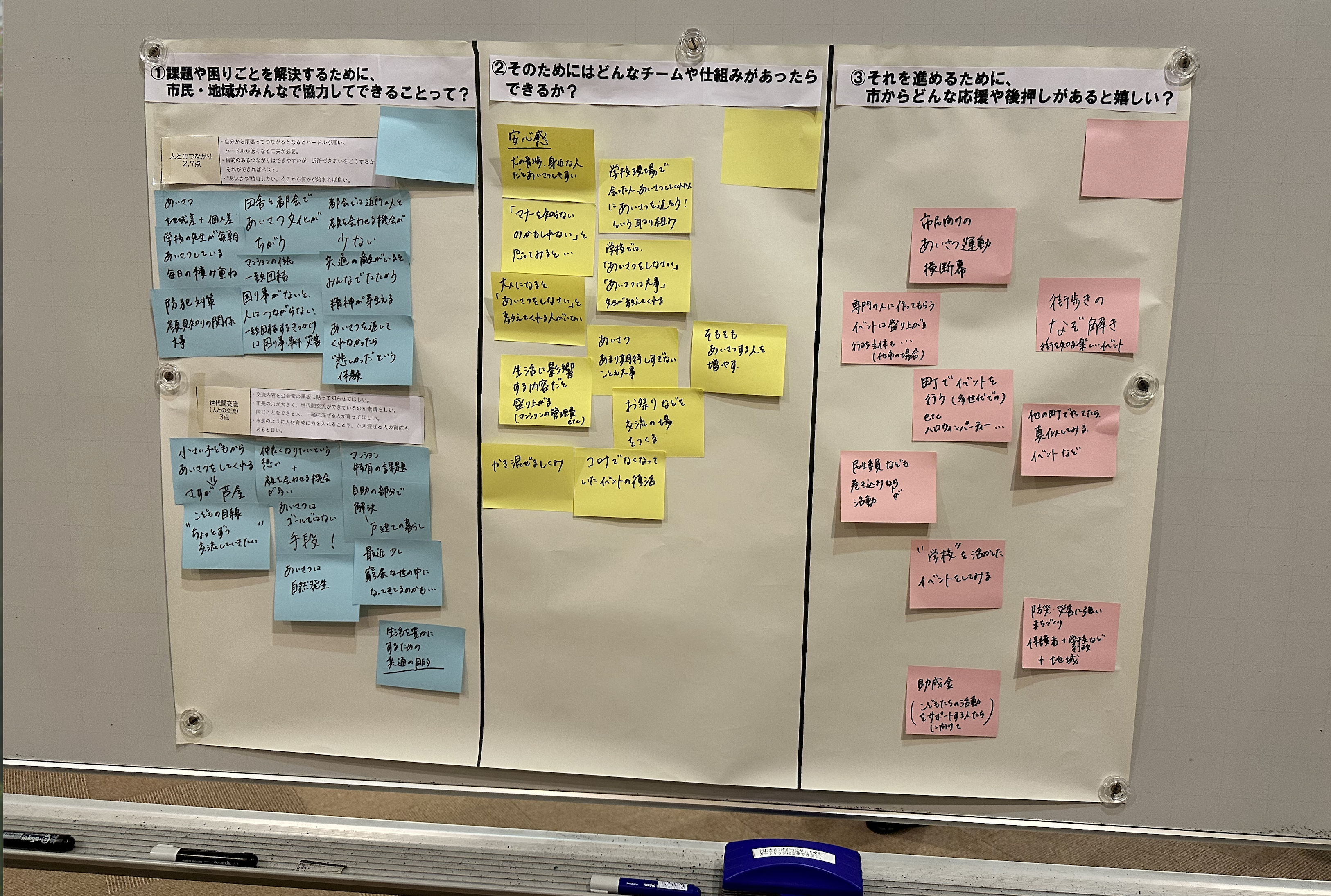 参加者はテーブルごとに分かれ、次の3つの問いについて話し合いました。課題や困りごとを解決するために、市民・地域がみんなで協力してできることは?そのためには、どんなチームや仕組みがあったらできるか?それを進めるために、市からどんな応援や後押しがあると嬉しいか?それぞれのテーブルからは、日々の暮らしの中で感じていることや、素朴な疑問、芦屋市の理想の姿など、さまざまな意見が出てきました。