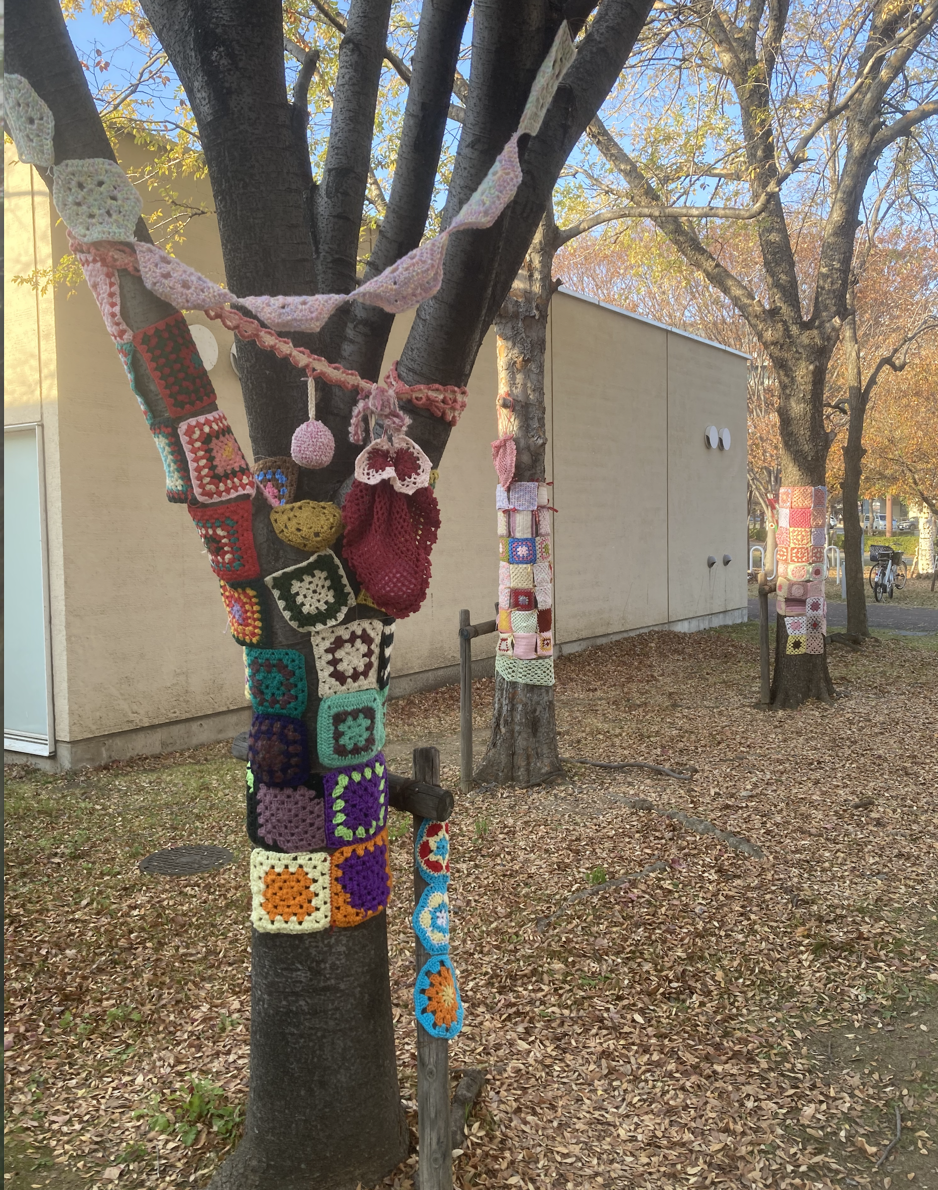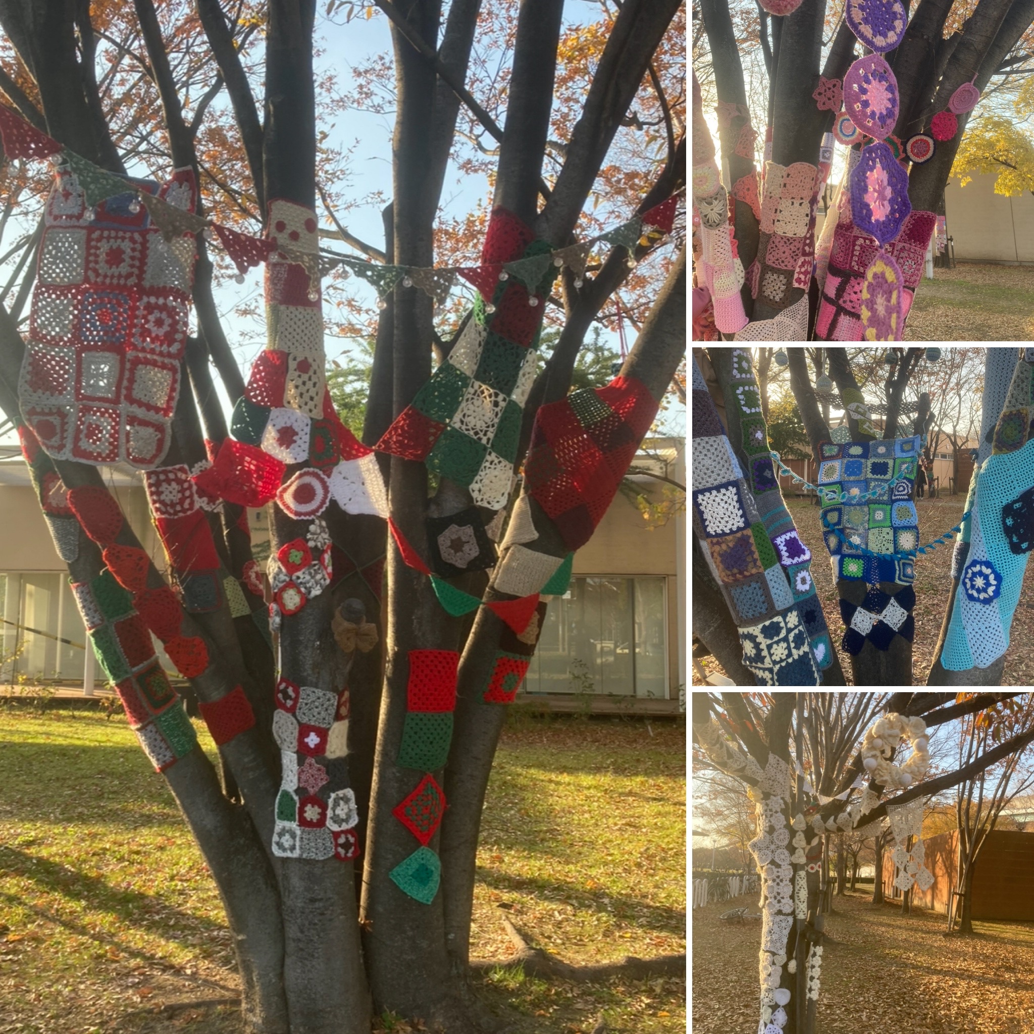 また、友人からの呼びかけをきっかけに、わかばこども食堂の皆さんにもお声がけいただき、準備期間が短かったにもかかわらず、先輩世代の方々を中心に、多くの「編み手」の皆さんが集まってくださいました。主催者のはからいで、「わかばこども食堂さんつながりの編み手さん」の作品として、3本の木の飾り付けが完成しました。
