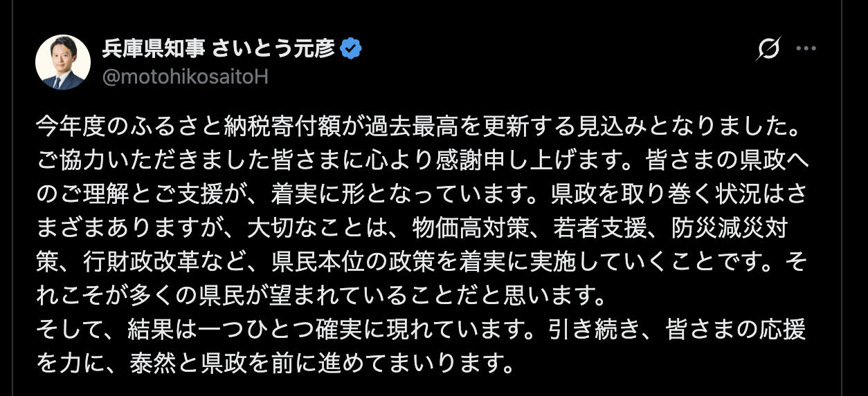では、兵庫県はこのふるさと納税の税収の結果をどのように県民に伝えているのかを見て比較してみましょう。斎藤知事からはこのように伝えられていました。